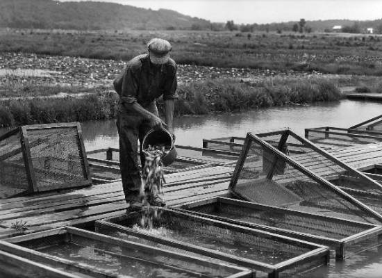 After being harvested from rearing ponds, fish are transported to a holding pond where they stay in vats awaiting sorting and shipping.