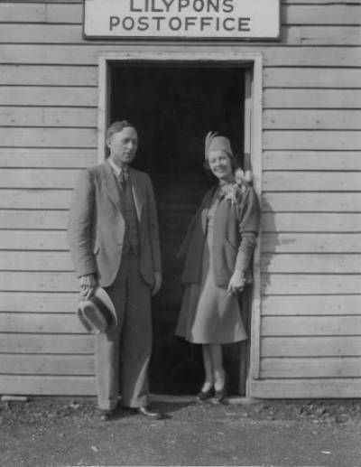 Lilypons Postmaster Clarence C. C. Thomas and Lily Pons at the Lilypons U. S. Post Office June, 1936, dedication.