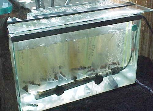 Sprouting setup, five gallon aquarium, submersible heater, airstone and thermometer