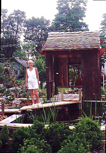 Linda Siler in front of a Tea House at O'Quinn's Water Gardens and Orchids, Springfield, MO